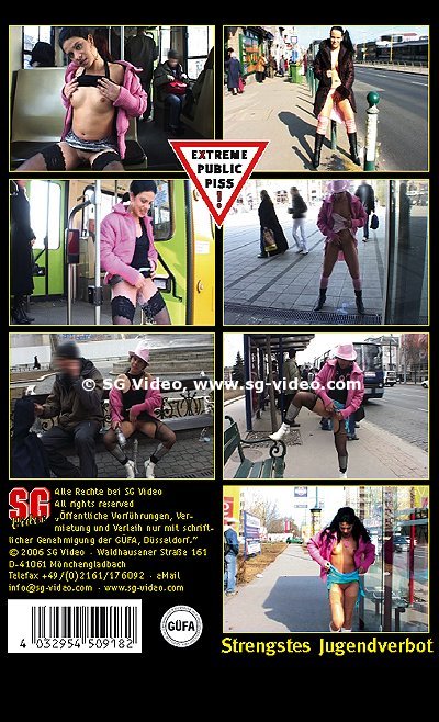 Молодая брюнетка в блядском прикиде и напрочь снесенной башней устраивает просто нереальный разврат средь бела дня. Девушка специально выискивает массовые скопления людей, у подземных переходов, на остановках общественного транспорта, площадях и демонстрирует публичный писсинг у них на глазах. А чтобы окончательно ввести народ в недоумение, ссыкушка любит помочиться в бутылку, после чего начинает с неё пить. Такое безобразие словами не описать, это нужно только видеть!